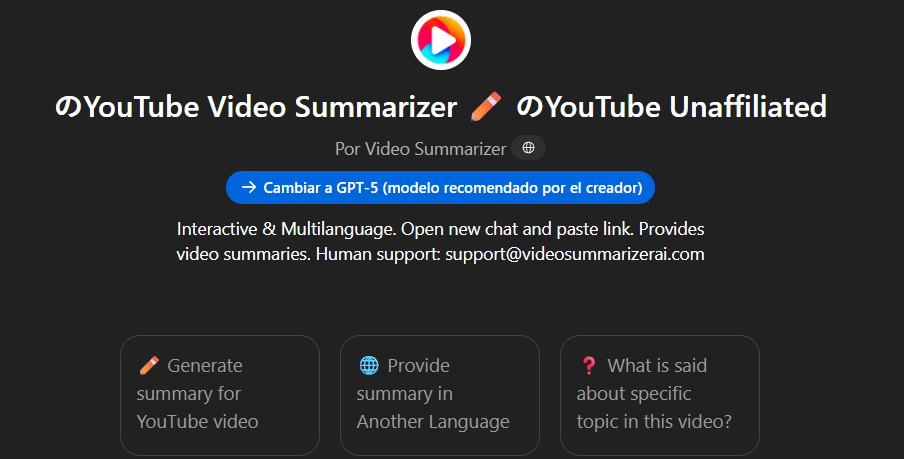 Interactivo y multilingüe. Abre un nuevo chat y pega el enlace. Ofrece resúmenes en video.