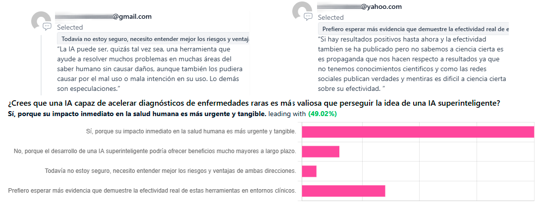 Respuestas a la encuesta pasada. ¿Crees que una IA capaz de acelerar diagnósticos de enfermedades raras es más valiosa que perseguir la idea de una IA superinteligente? y prevalece: “Sí, porque su impacto inmediato en la salud humana es más urgente y tangible”.