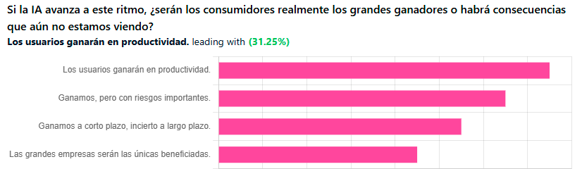 Respuestas a encuesta pasada. Si la IA avanza a este ritmo, ¿serán los consumidores realmente los grandes ganadores o habrá consecuencias que aún no estamos viendo? y prevalece: “Los usuarios ganarán en productividad.