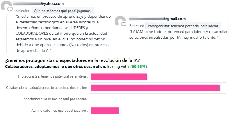 Respuestas a encuesta pasada: ¿Seremos protagonistas o espectadores en la revolución de la IA? y prevalece: “Colaboradores: adoptaremos lo que otros desarrollen”.