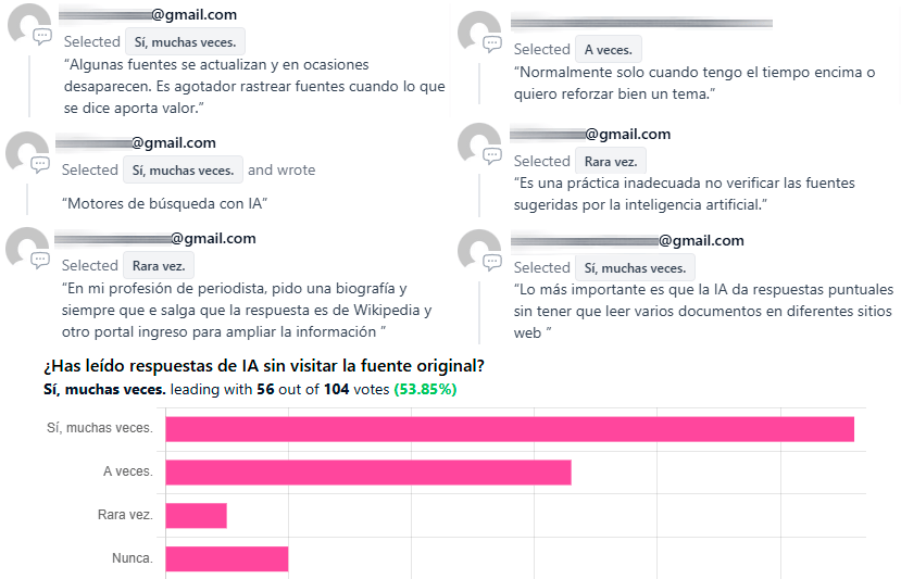 Respuestas a encuesta pasada: ¿Has leído respuestas de IA sin visitar la fuente original? y prevalece: “Sí, muchas veces”.
